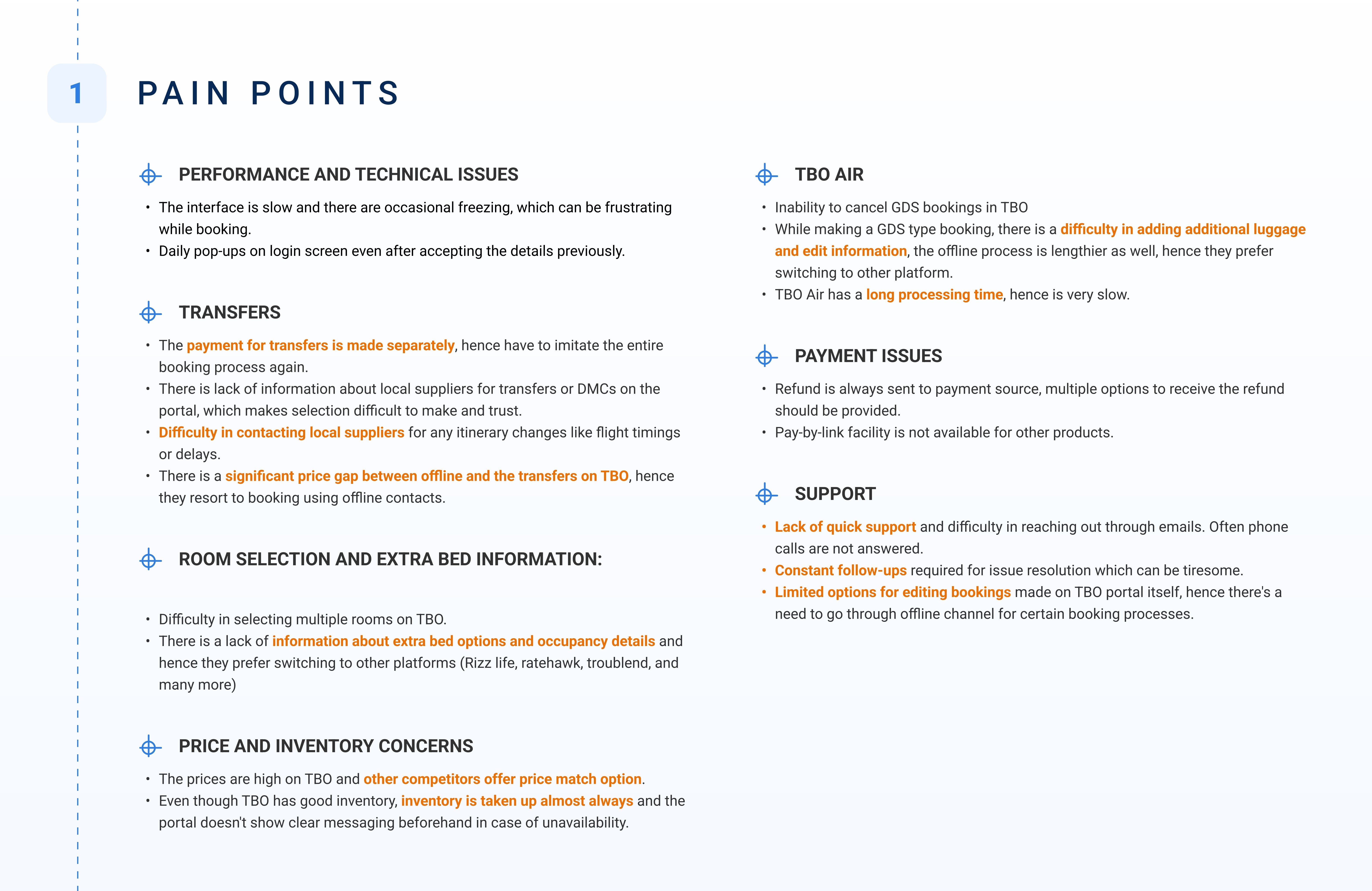 Identified 15+ recurring pain points around pricing transparency, booking speed, and multi-room workflows.