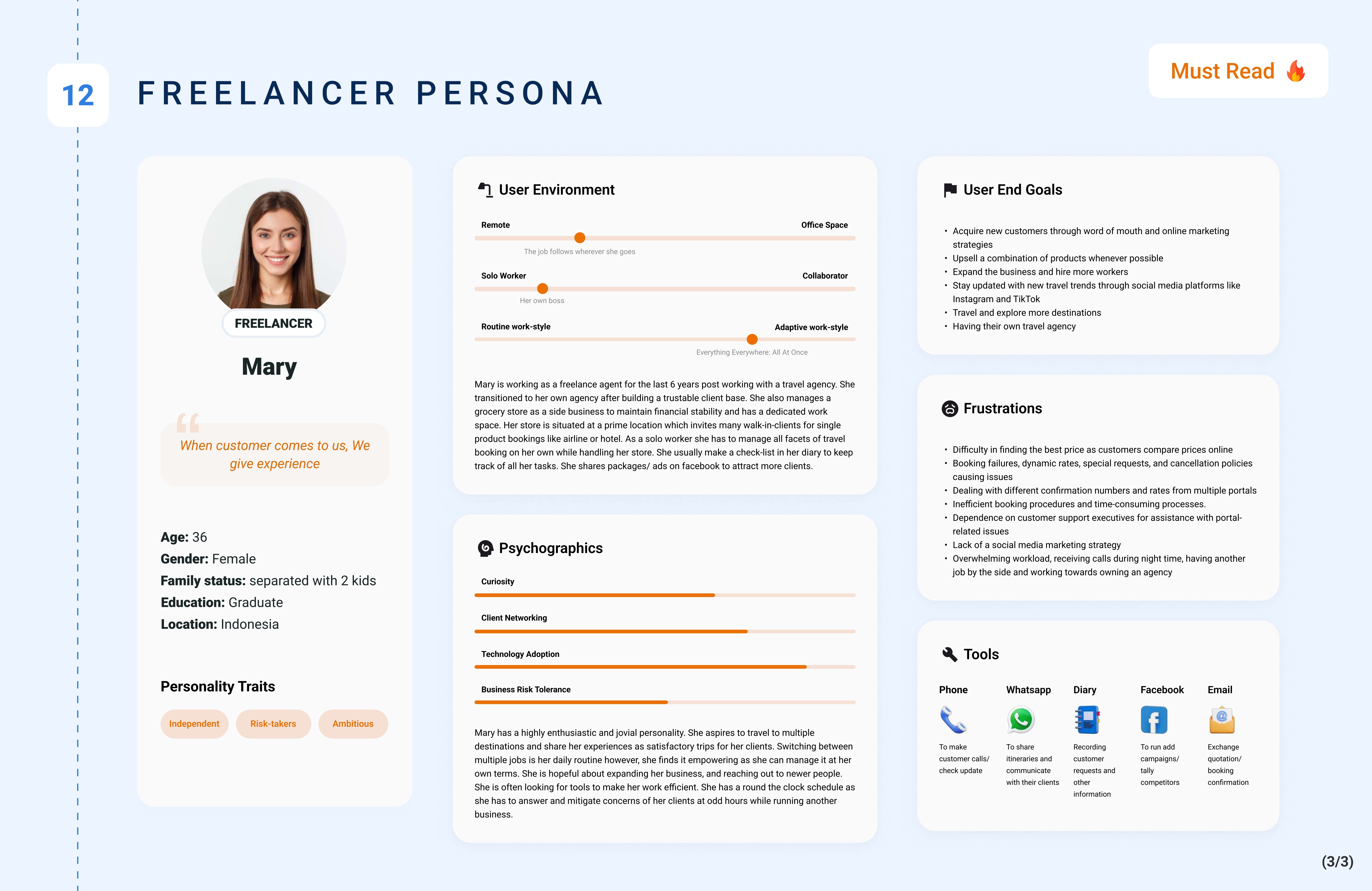 Mapped three primary agent personas — Agency Owner, Booker, and Freelancer — capturing differences in goals, workflows, and digital maturity.